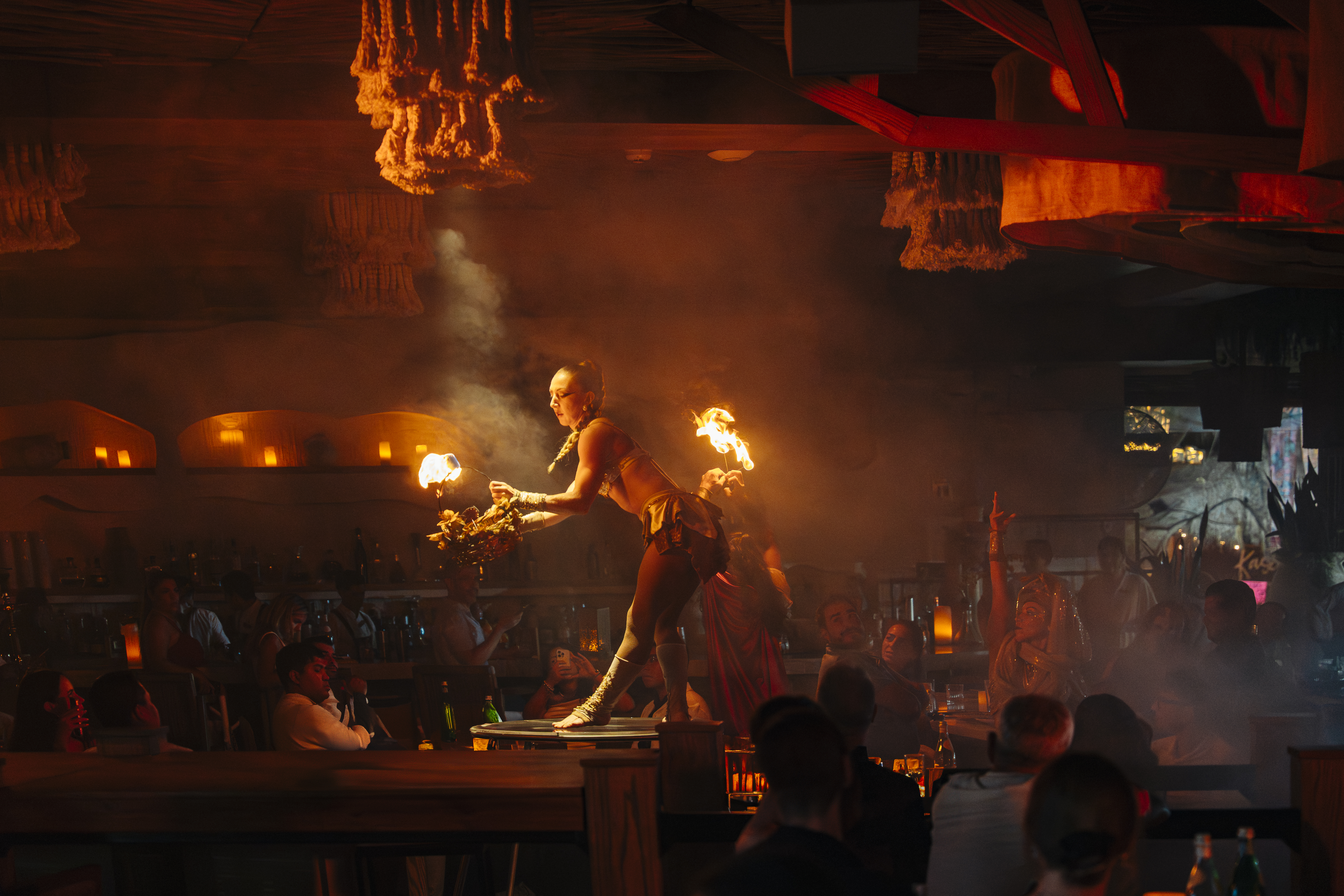 Si hay un momento que define a Ilios es el espectáculo de fuego. Las llamas iluminan el espacio, el beat sube y las miradas se concentran en el centro del restaurante. Es el punto exacto donde la cena evoluciona en celebración.
